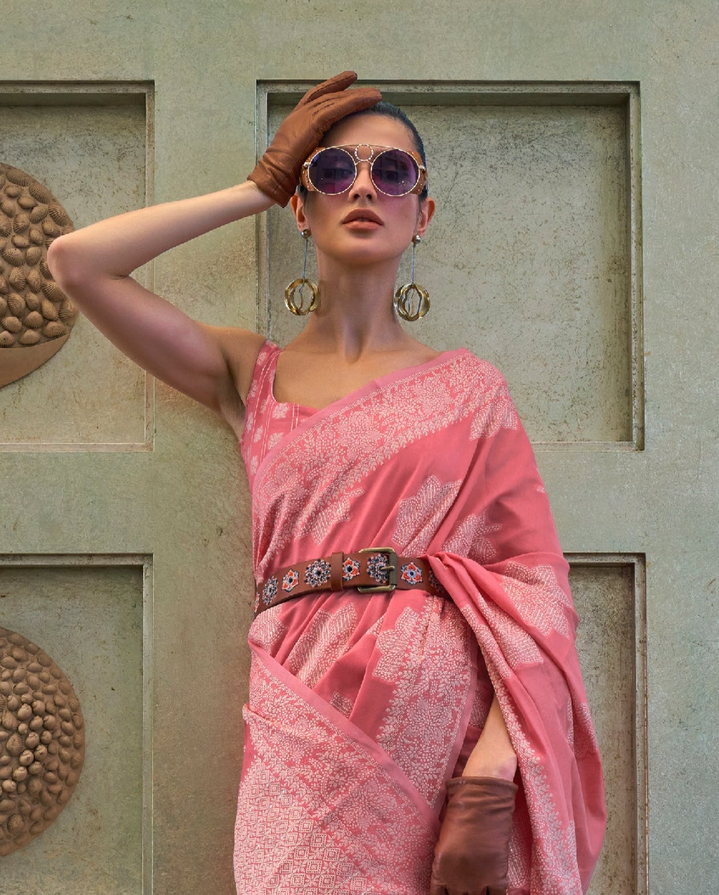 Step into timeless elegance with the Delicate Light Pink Lucknowi Woven Chikankari Saree, where every thread weaves a story of grace and refined charm.