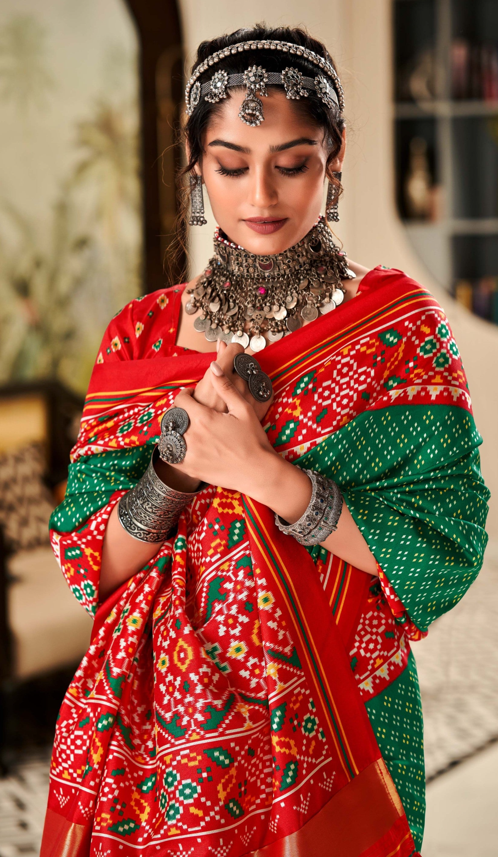 Dual Tone Clover Green and Red Printed Patola Silk Saree: Embrace Vibrant Elegance
