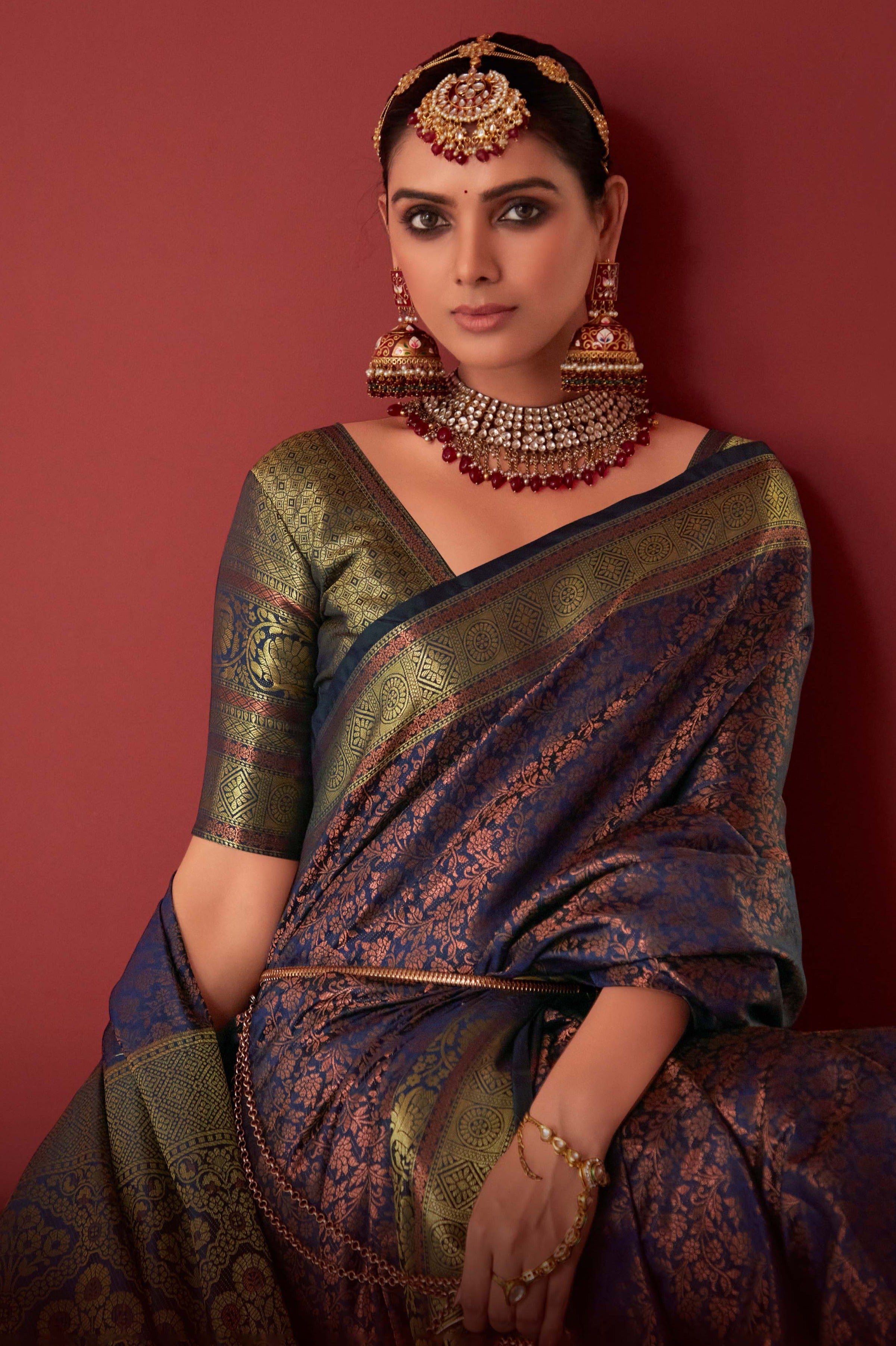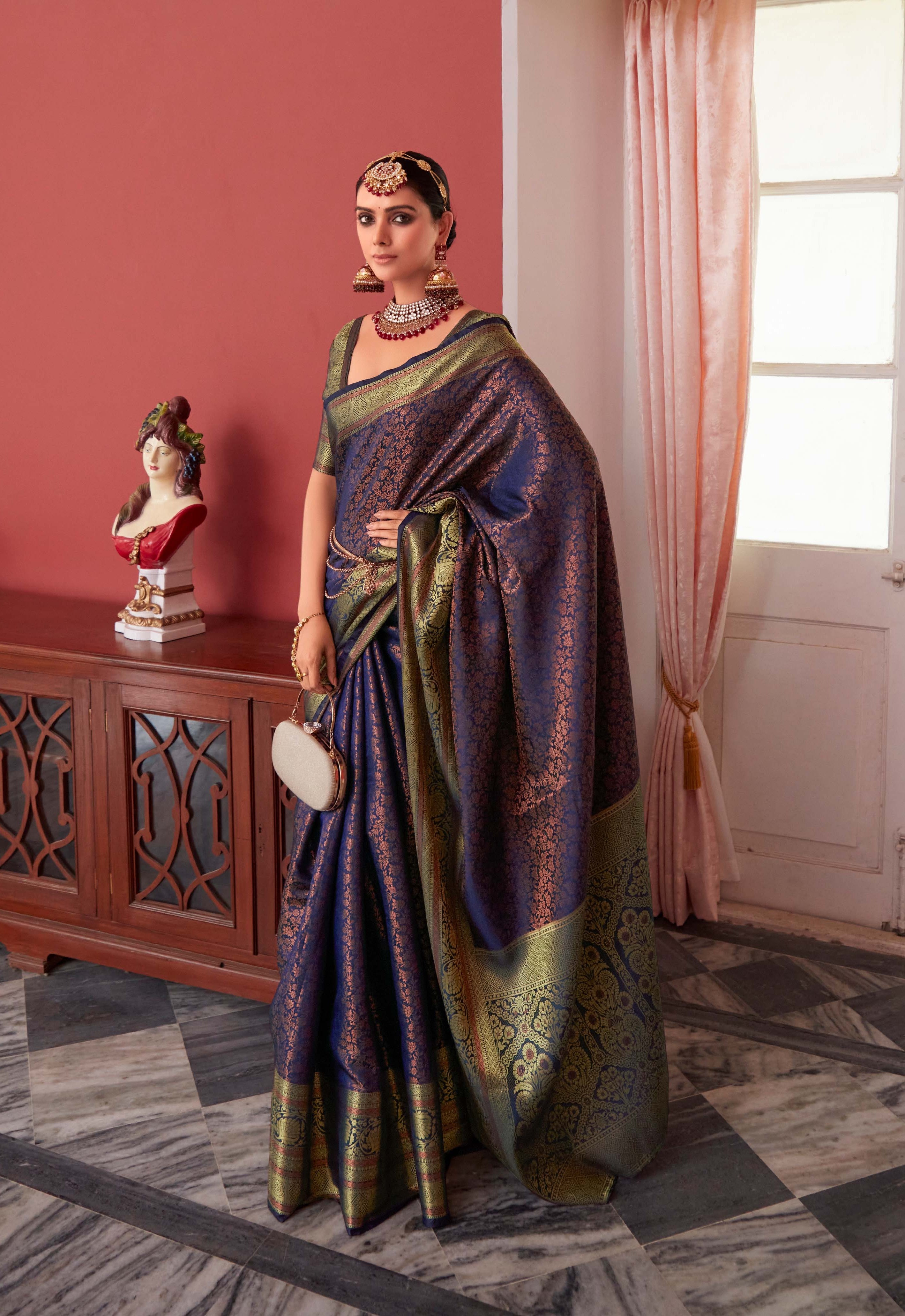 - Luxurious Banarasi silk adorned with intricate zari weaving in dual-tone purple and green.
