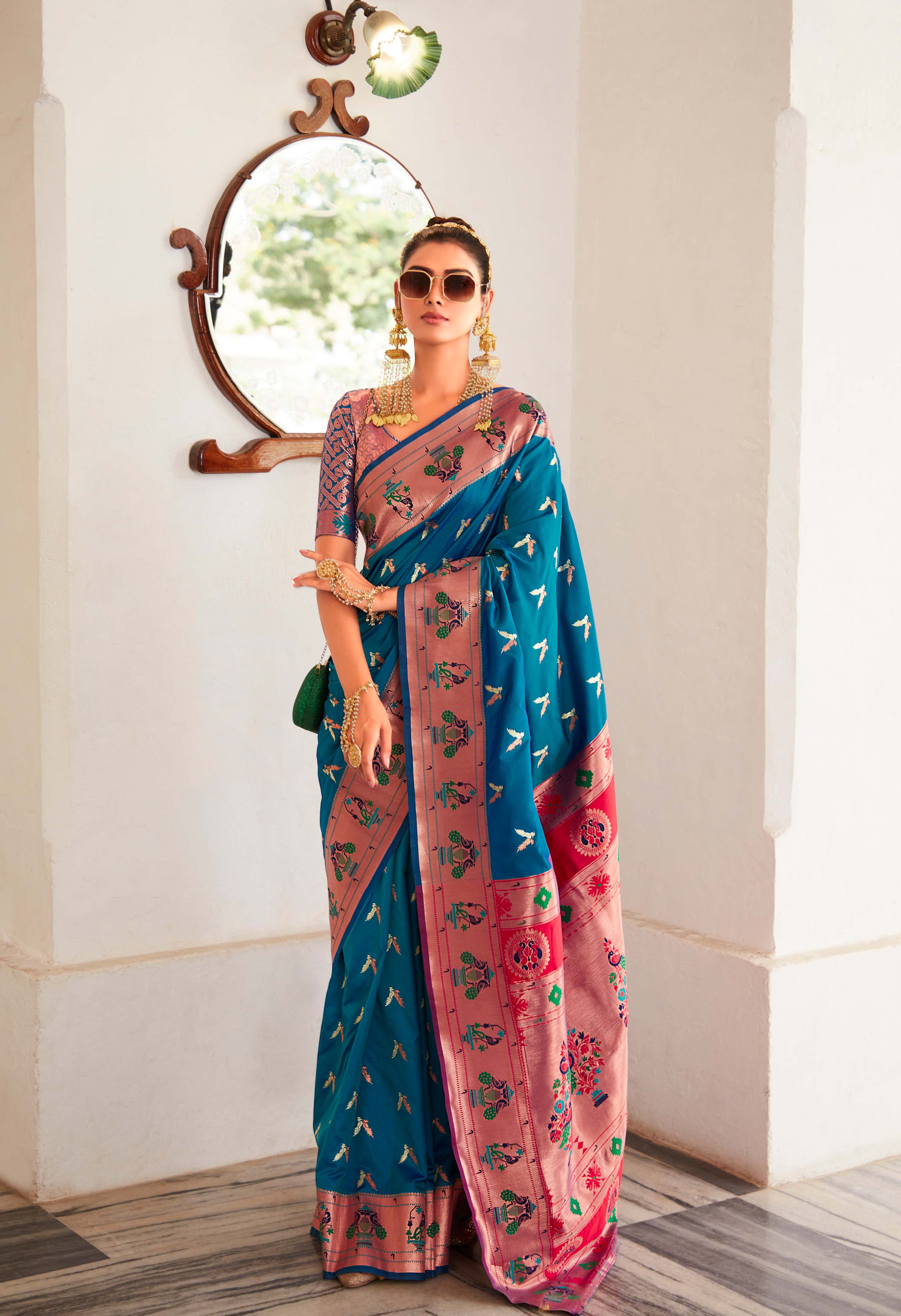 Electric Blue and Pink Zari Woven Paithani Silk Saree