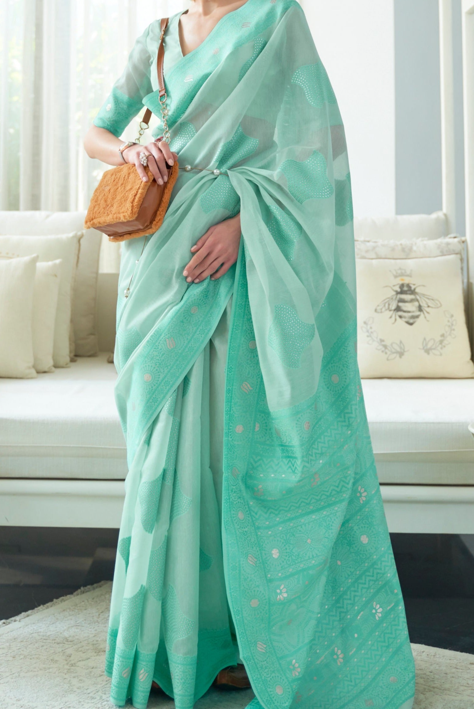 Elegant Aqua blue Lucknowi Chikankari Woven Silk Saree
