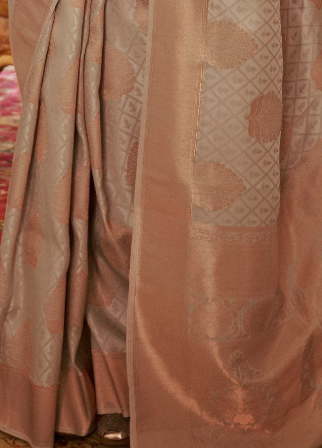 Elevate your attire with the Elegant Cream Banarasi Copper Zari Silk Saree, a masterpiece of craftsmanship and elegance that embodies tradition and luxury.