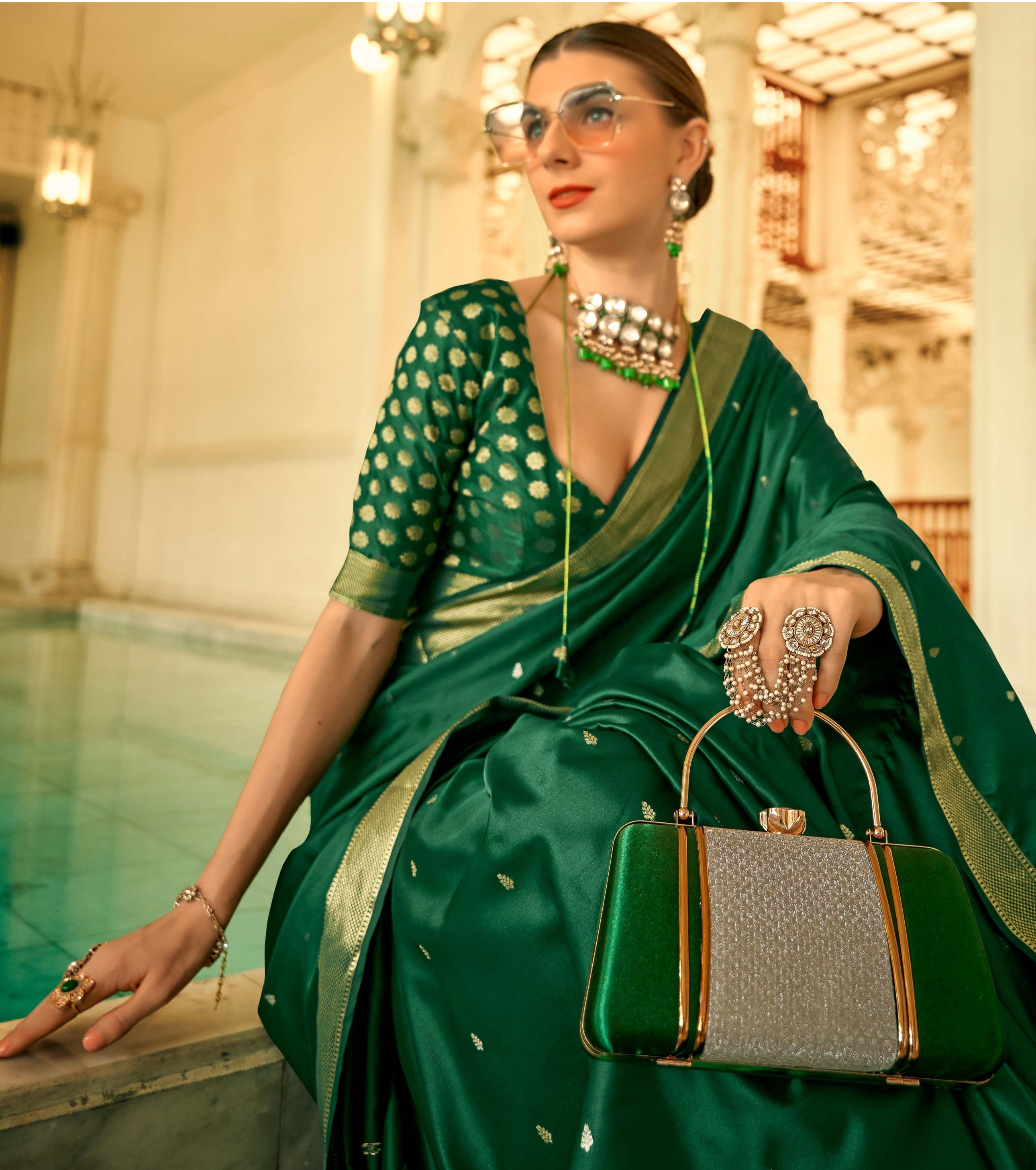Elegant Dark Green Zari Woven Satin Silk Saree - Perfect for Special Occasions