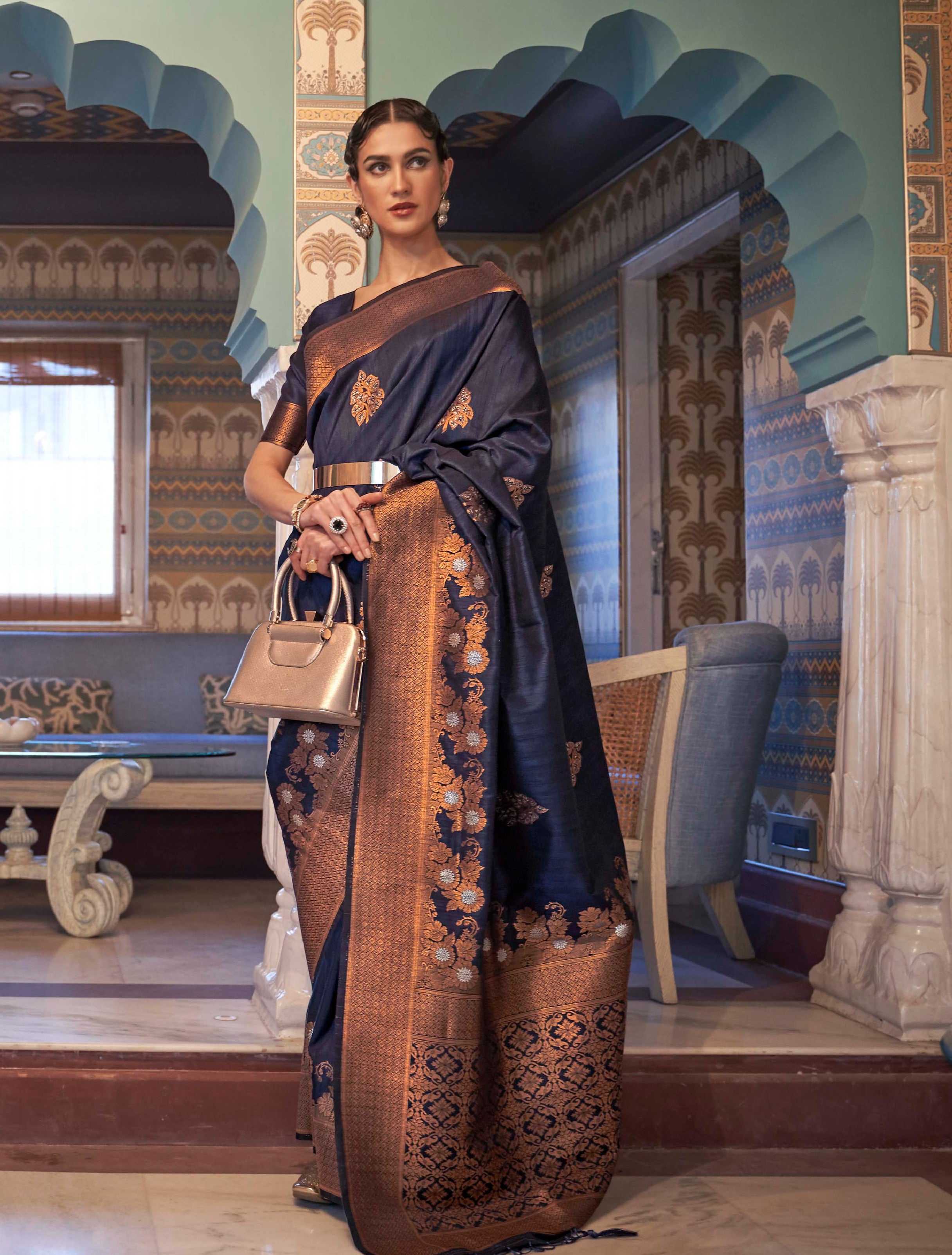 Majestic Dark Grey Zari Woven Tussar Silk Saree