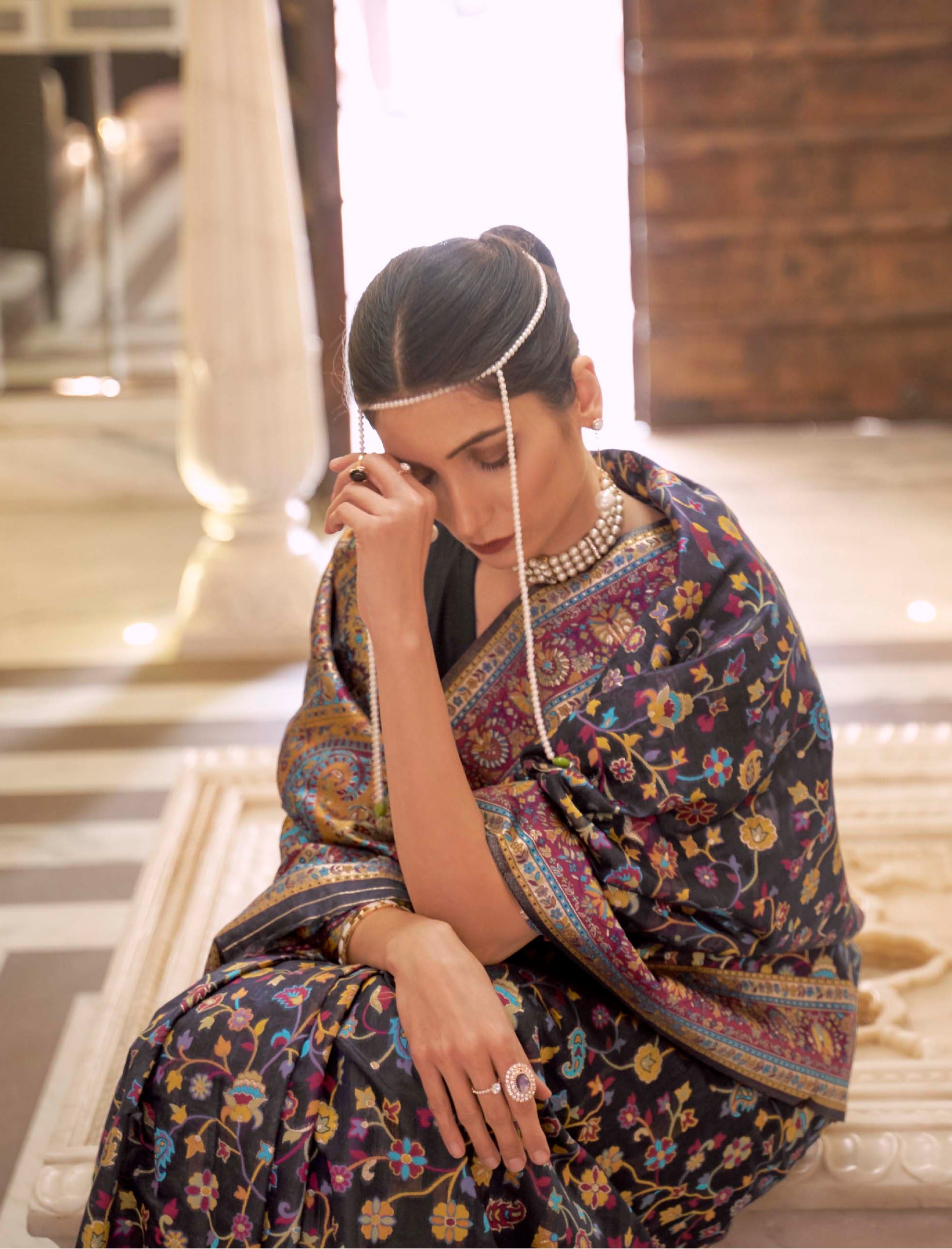 Elevate your ethnic wardrobe with the Elegant Grey Banarasi Jamawar Woven Silk Saree, a stunning fusion of tradition and modern sophistication.
