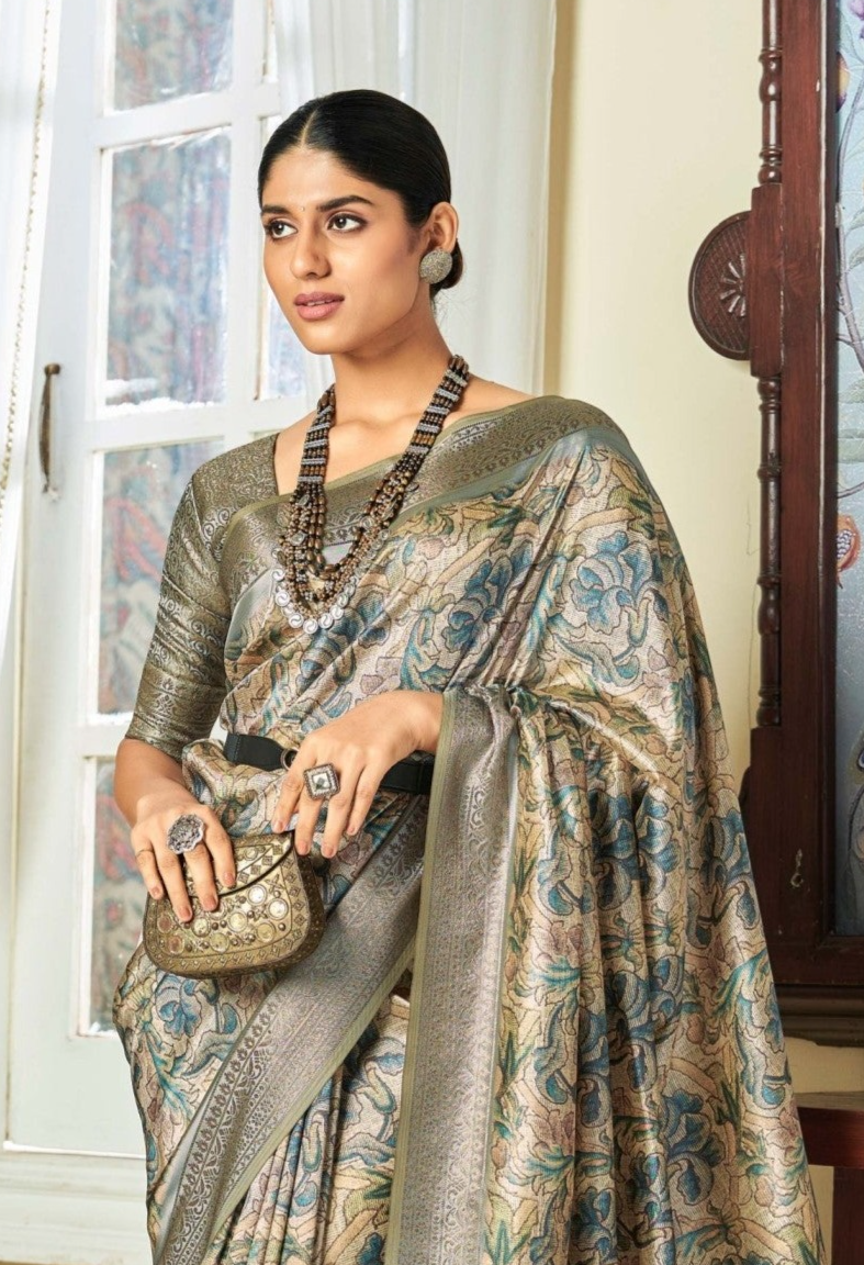 Elegant Grey Banarasi Satin Silk Saree