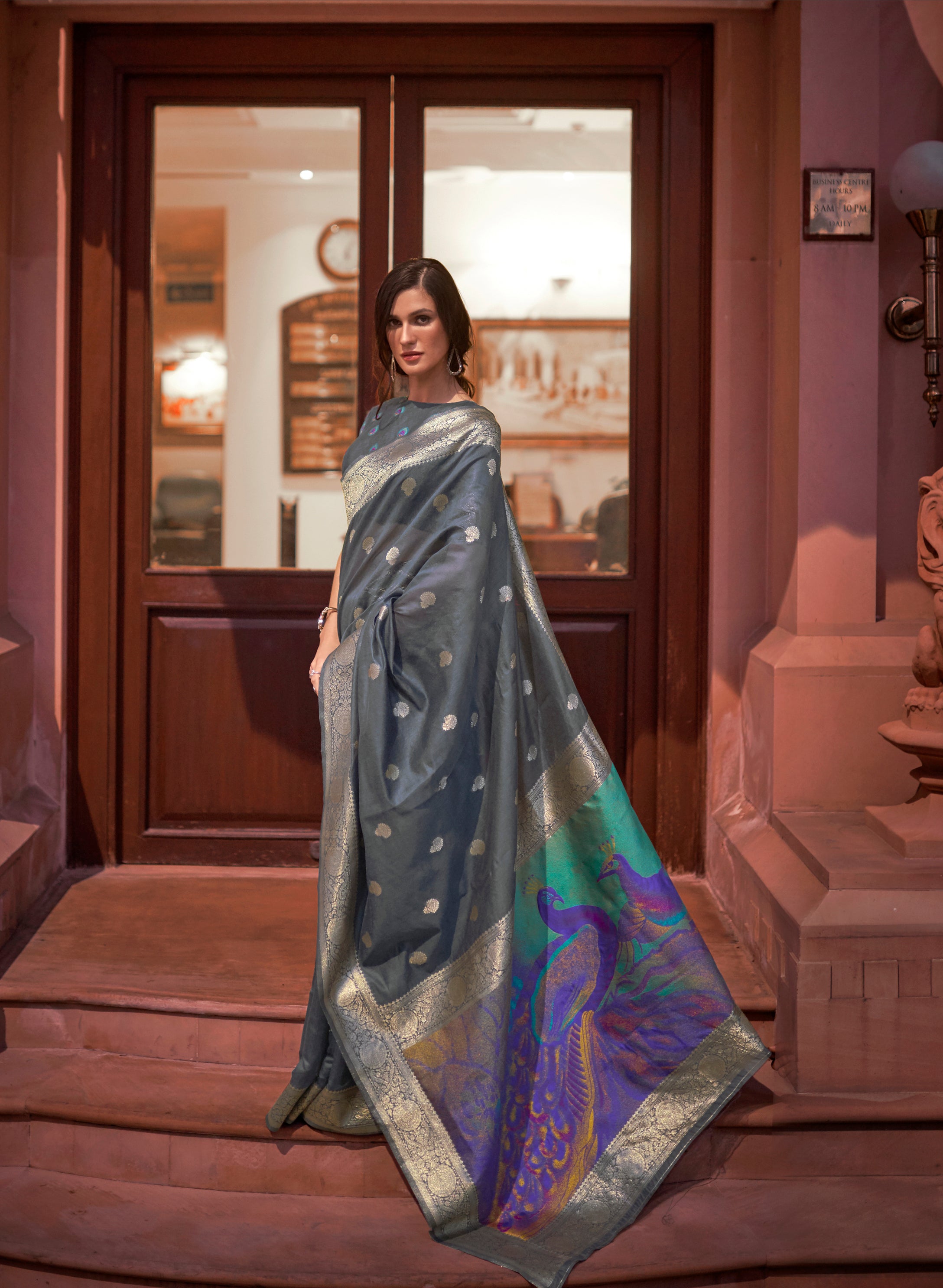 Elegant Grey Zari Woven Banarasi Silk Saree with Peacock Pallu