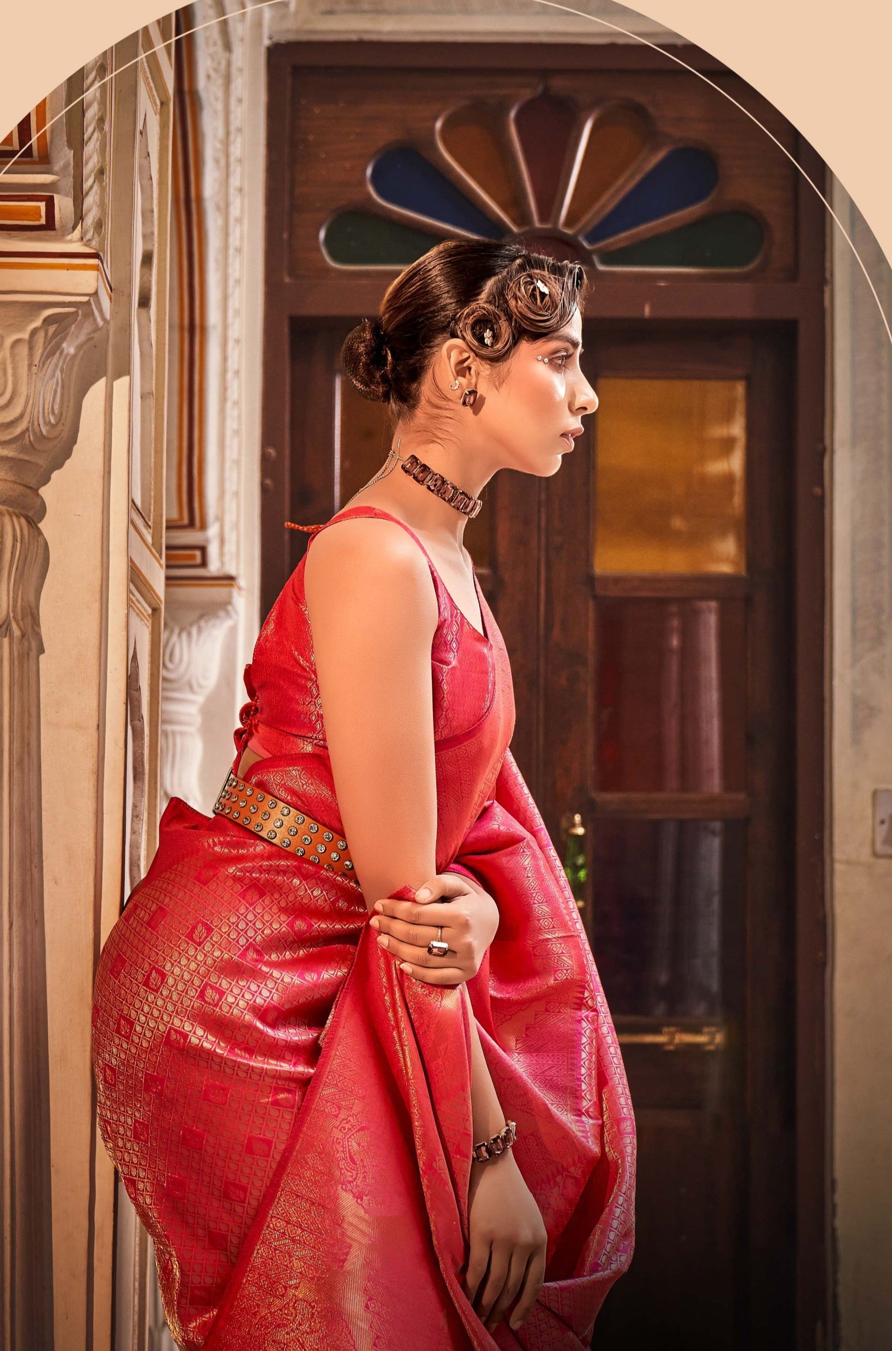 Statement Piece: Elevate your wardrobe with the Elegant Light Red Zari Woven Kanjivaram Silk Saree, a symbol of refined beauty.
