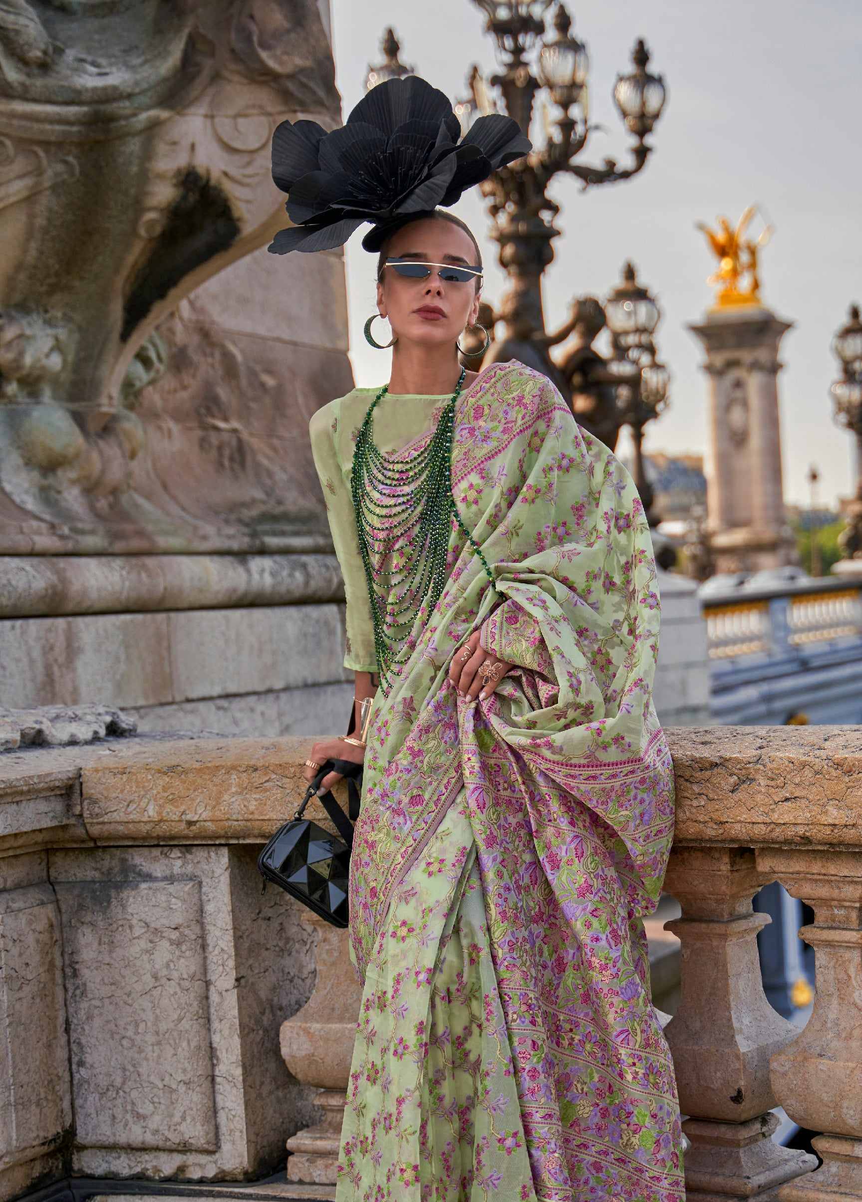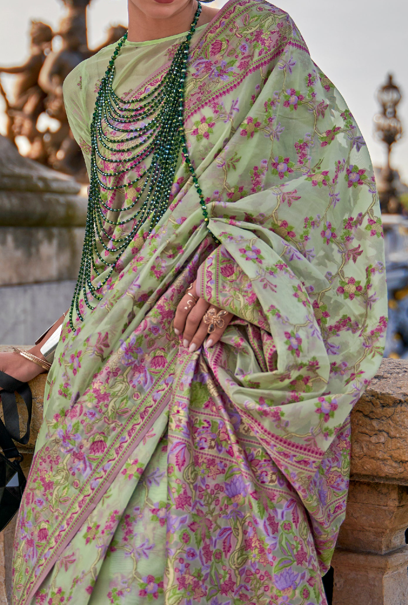 Elegant Mint Green Organza Handloom Parsi Saree - A Refreshing Blend of Tradition and Grace