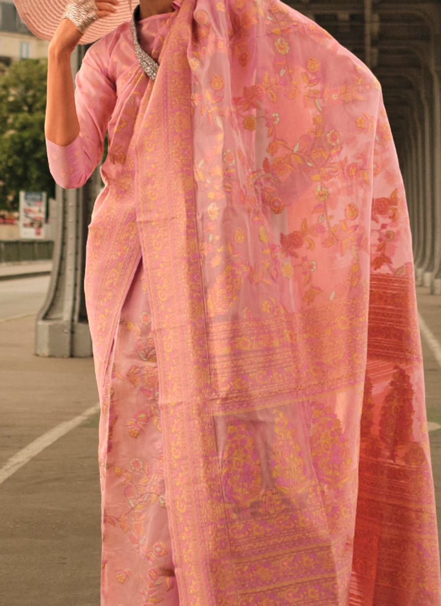Elegant Peach Kashmiri Organza Handloom Saree - A Touch of Timeless Grace