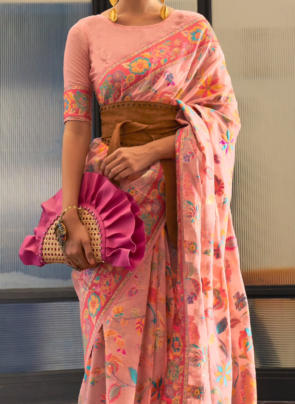 Elegant Pink Jamewar Kashmiri Cotton Silk Saree - Timeless Elegance for Special Occasions