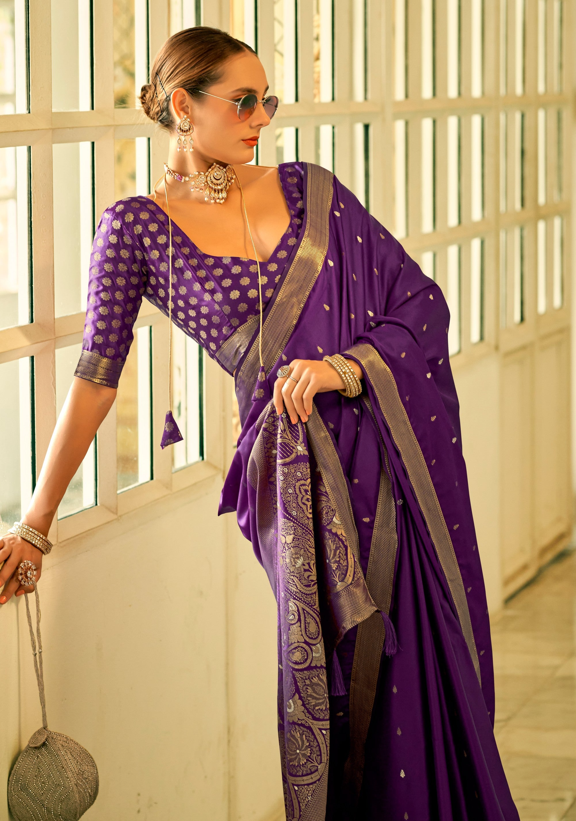 Statement Piece: Elevate your attire with the Elegant Purple Zari Woven Satin Silk Saree, a symbol of timeless beauty and cultural richness.
