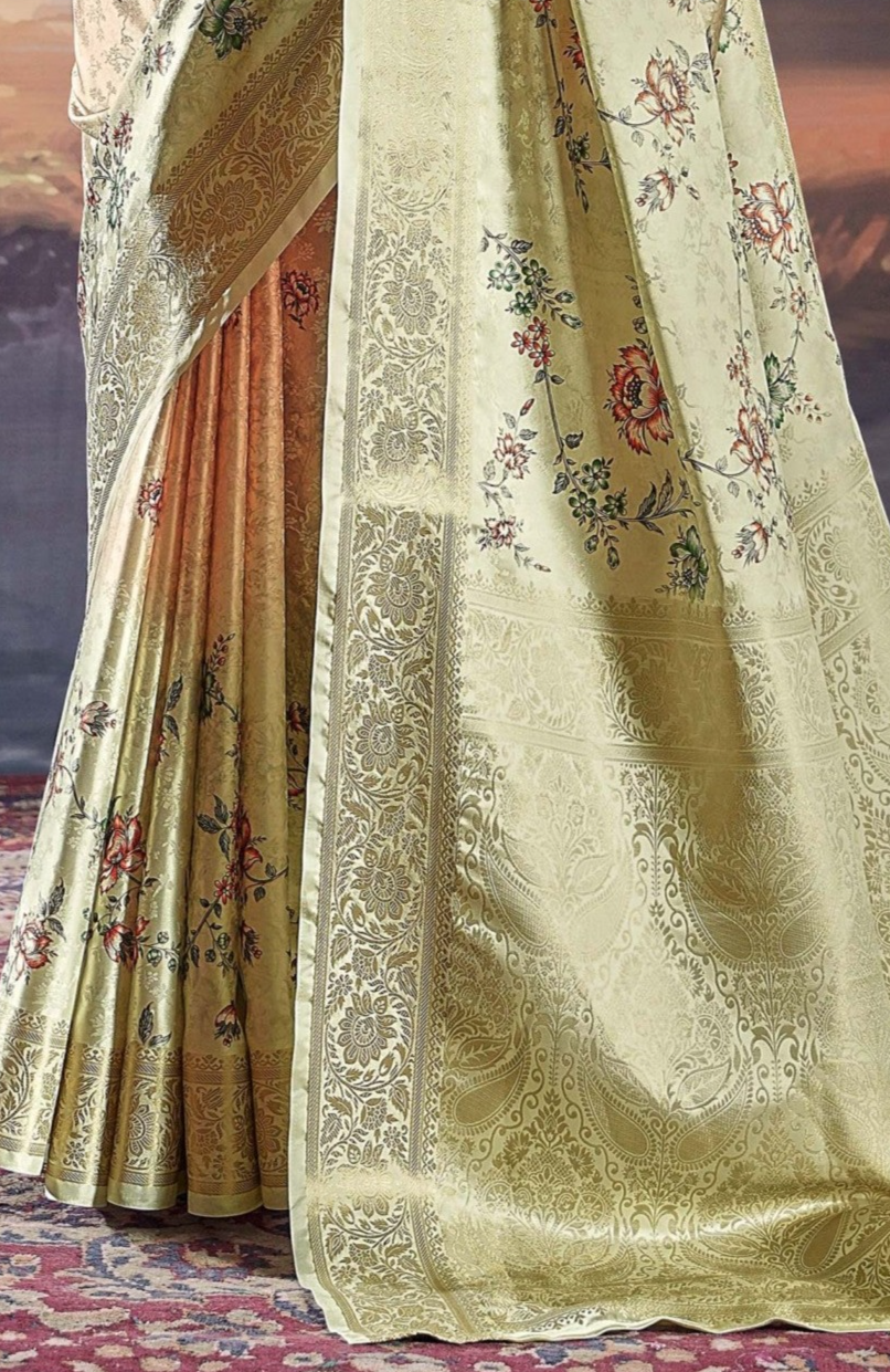 Beige Digital Floral Printed Pure Satin Silk Saree: Elevate Your Style with Graceful Elegance