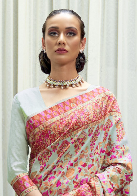 Pista Green Kashmiri Jamewar Handloom Saree: Timeless Elegance for Special Occasions