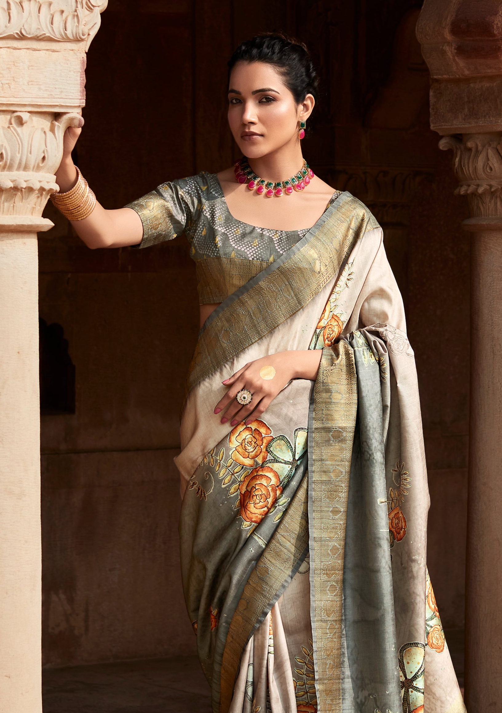 Misty Grey Digital Printed Soft Silk Saree: Contemporary Elegance at Its Finest