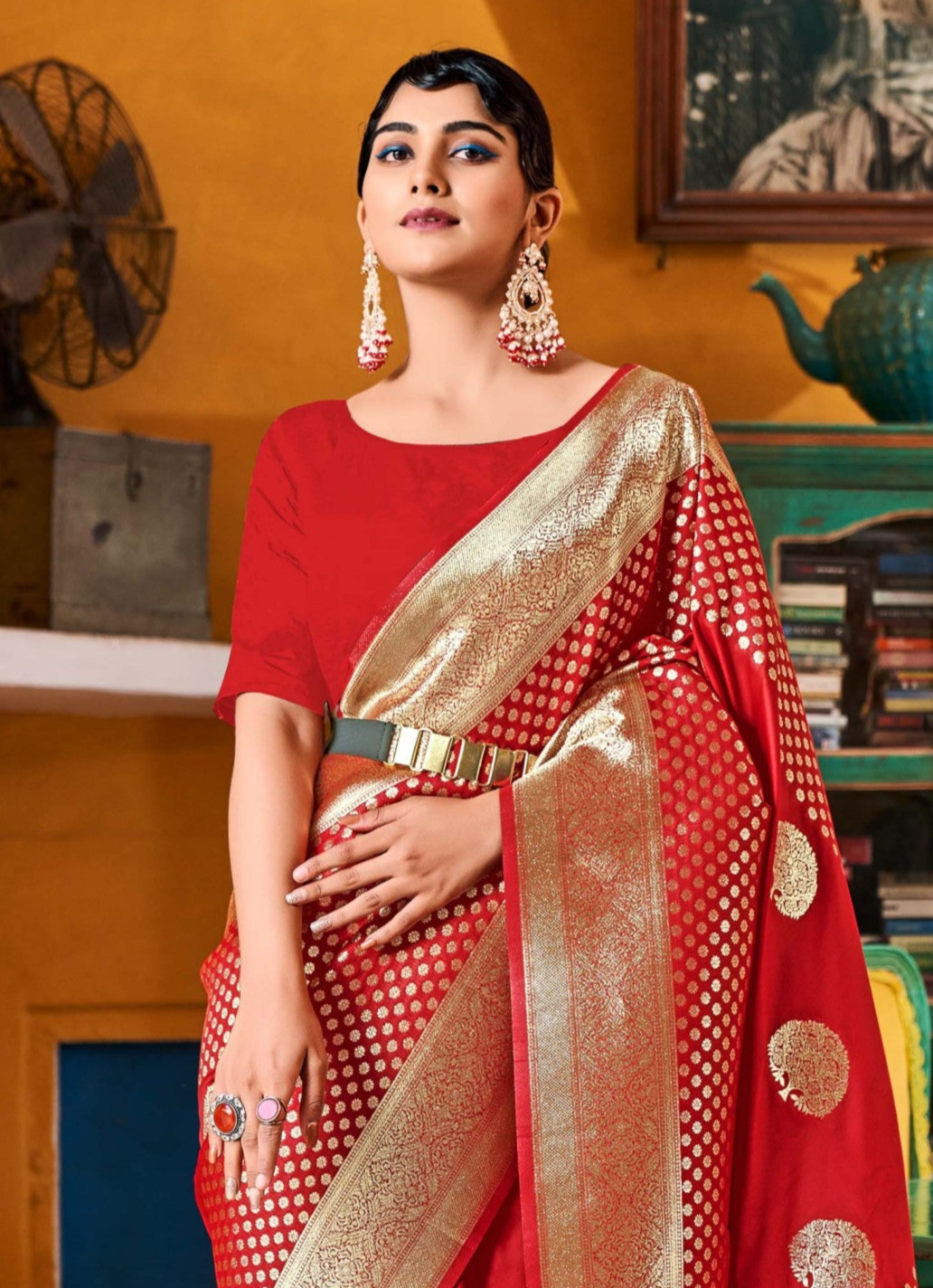 Intricate Design: Adorned with detailed Zari woven patterns in a vibrant red hue, highlighting the craftsmanship of Banarasi silk.
