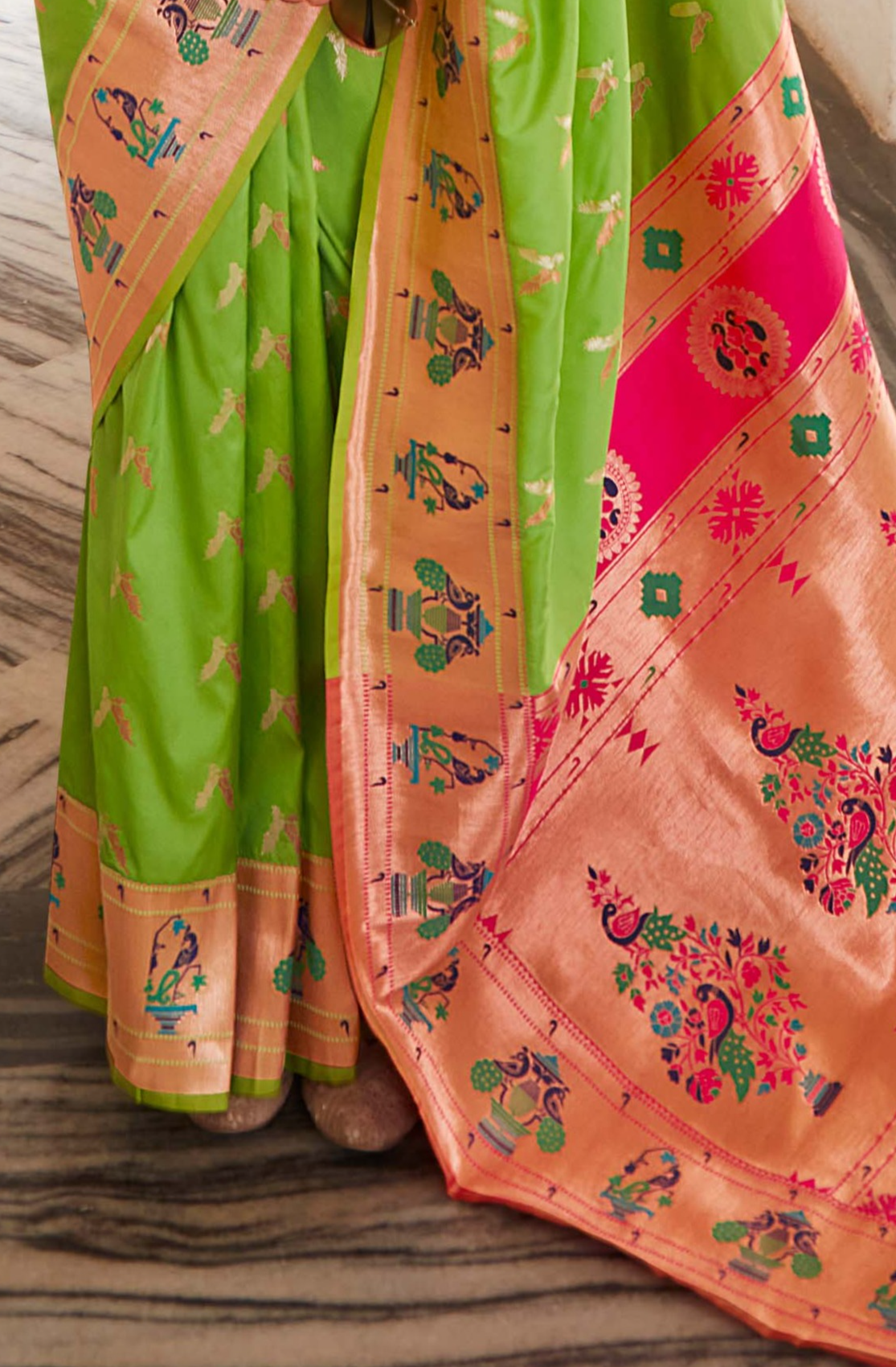 Pistachio Green and Pink Zari Woven Paithani Silk Saree