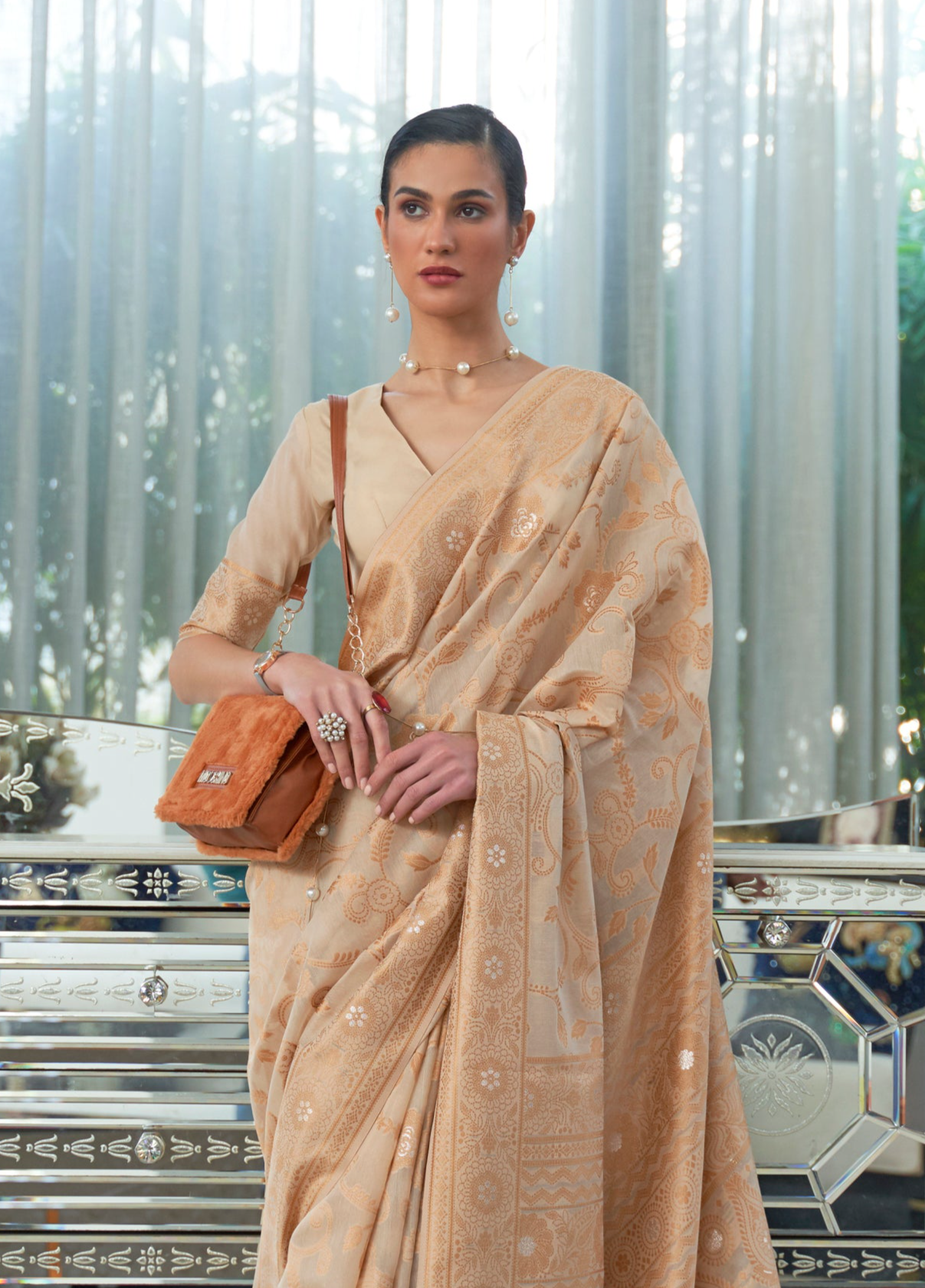 Elevate your ethnic wardrobe with the Exquisite Tan Lucknowi Chikankari Woven Silk Saree, a stunning blend of tradition and modern elegance.