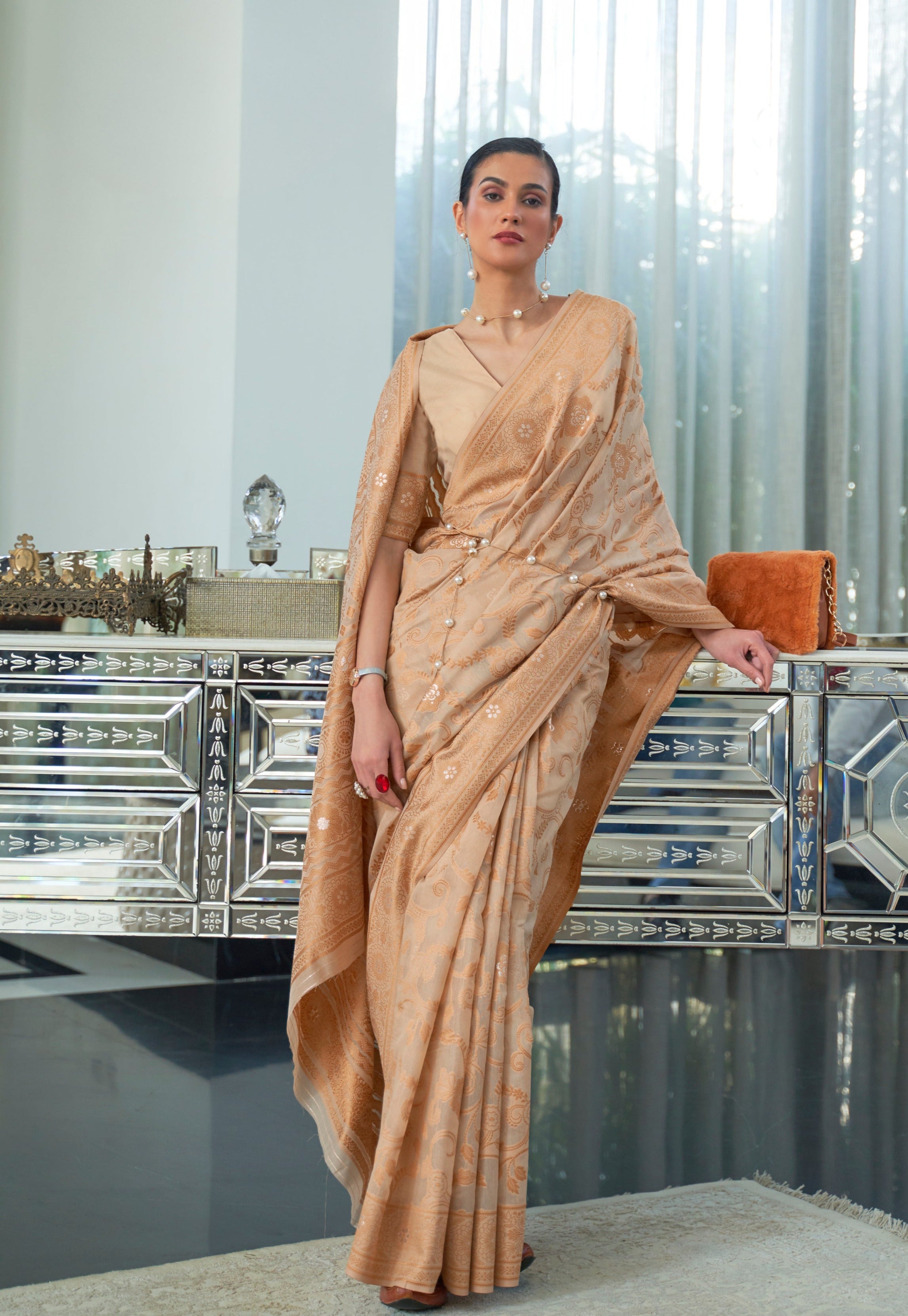 Beautiful Tan Lucknowi Chikankari Woven Silk Saree for Timeless Elegance