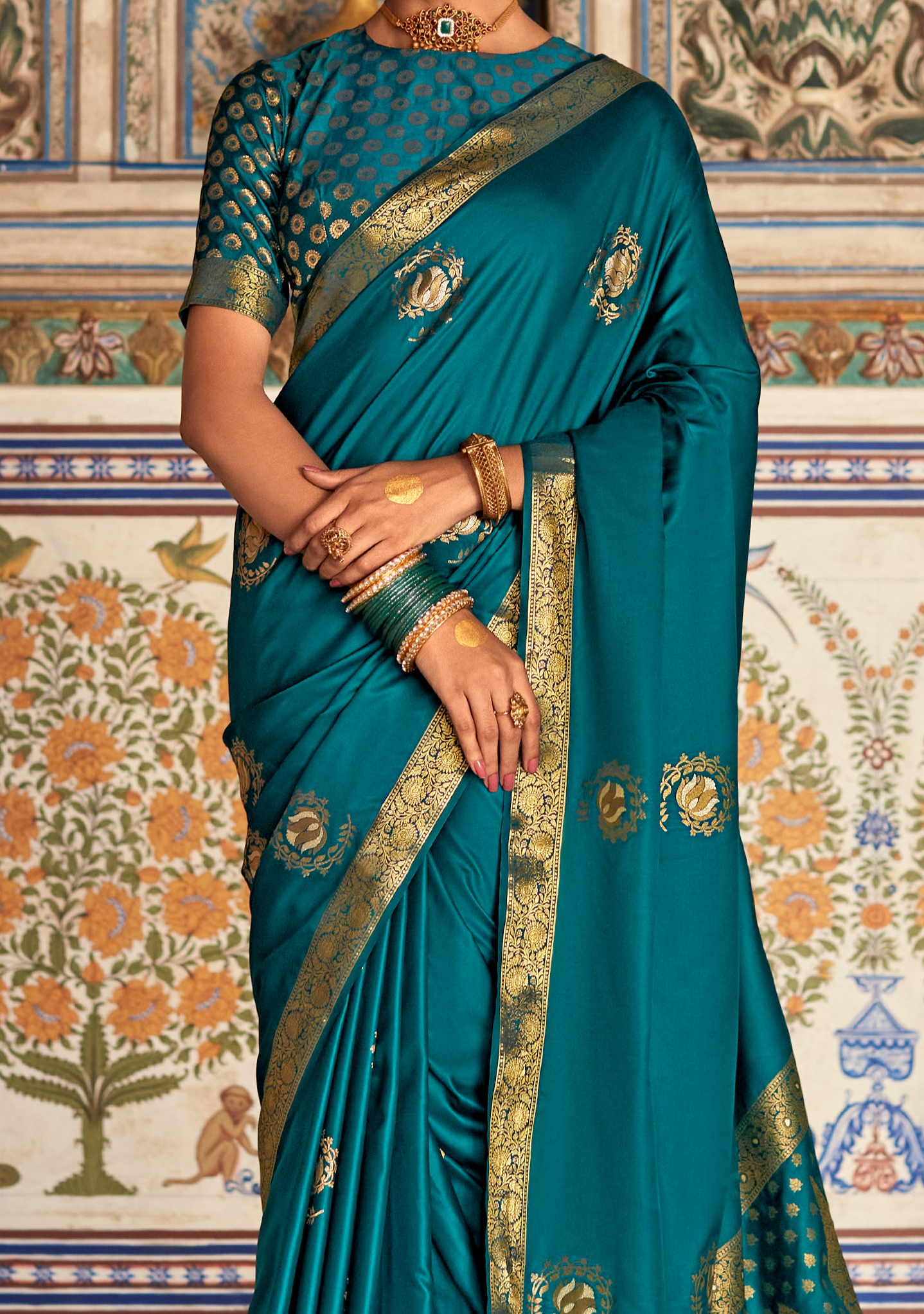 - Luxurious Banarasi satin silk exuding regal charm and opulence.