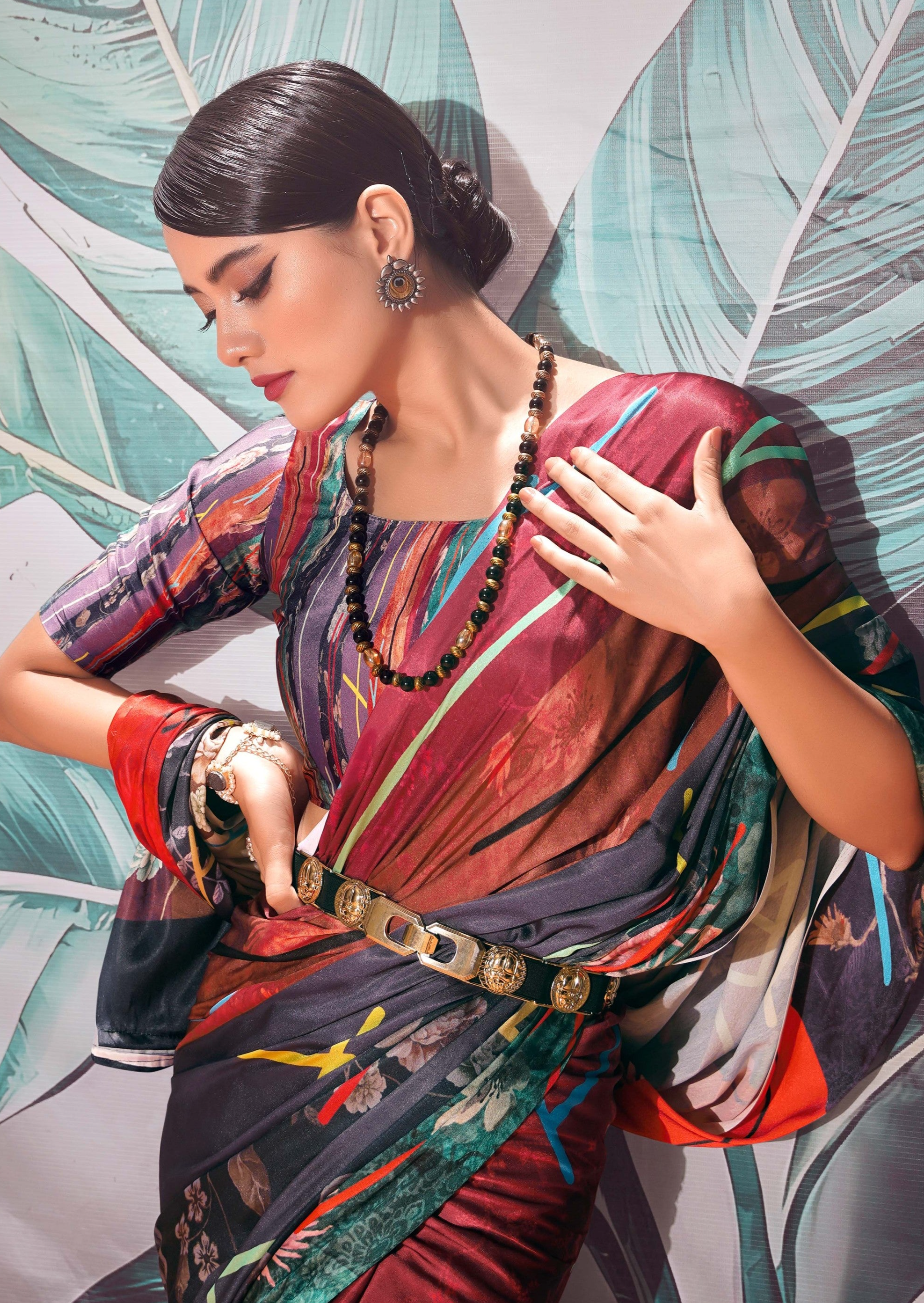 Sardine Grey Printed Satin Silk Saree: Dive into Elegance with Every Fold