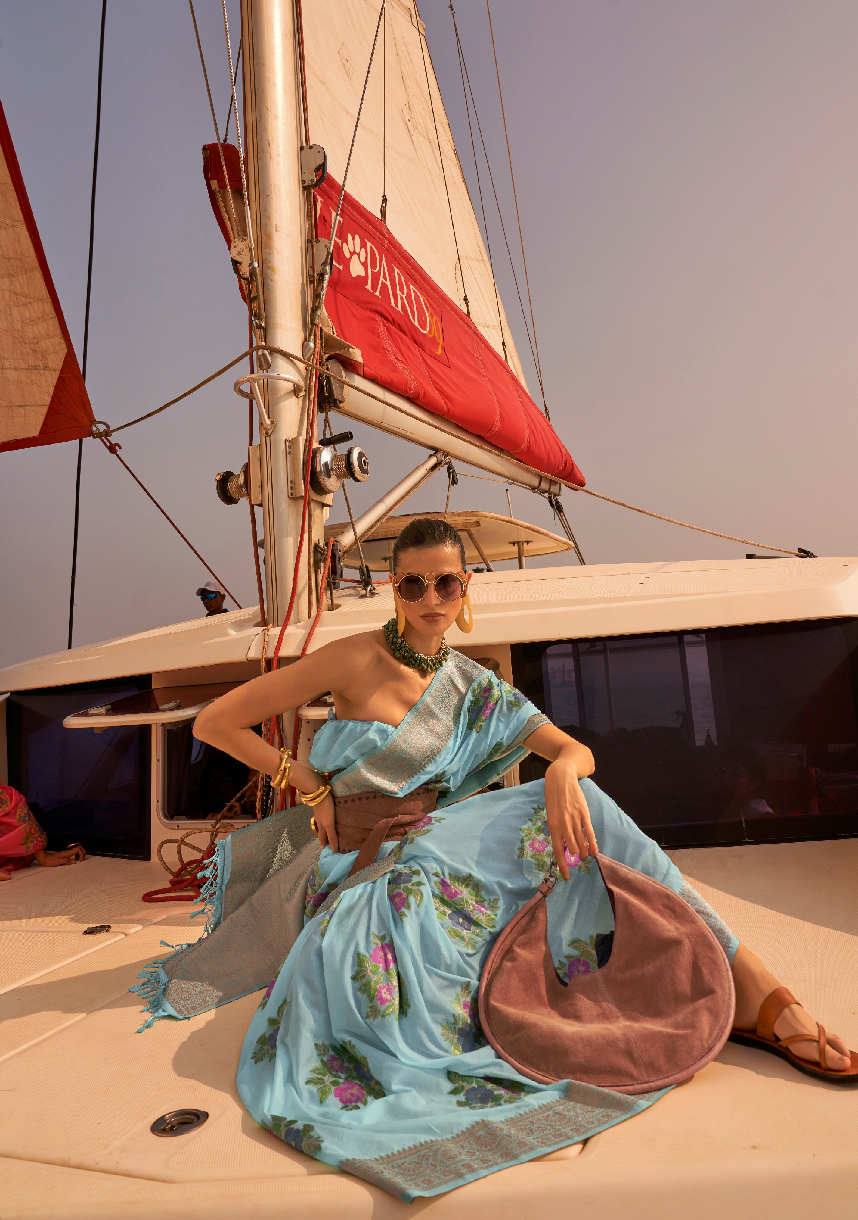 Serene Sky Blue Chinon Handloom Woven Silk Saree