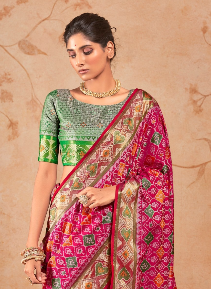 Intricate Design: Embrace elegance with our Shiraz Pink Zari Woven Patola Silk Saree, adorned with intricate patterns that showcase meticulous craftsmanship.