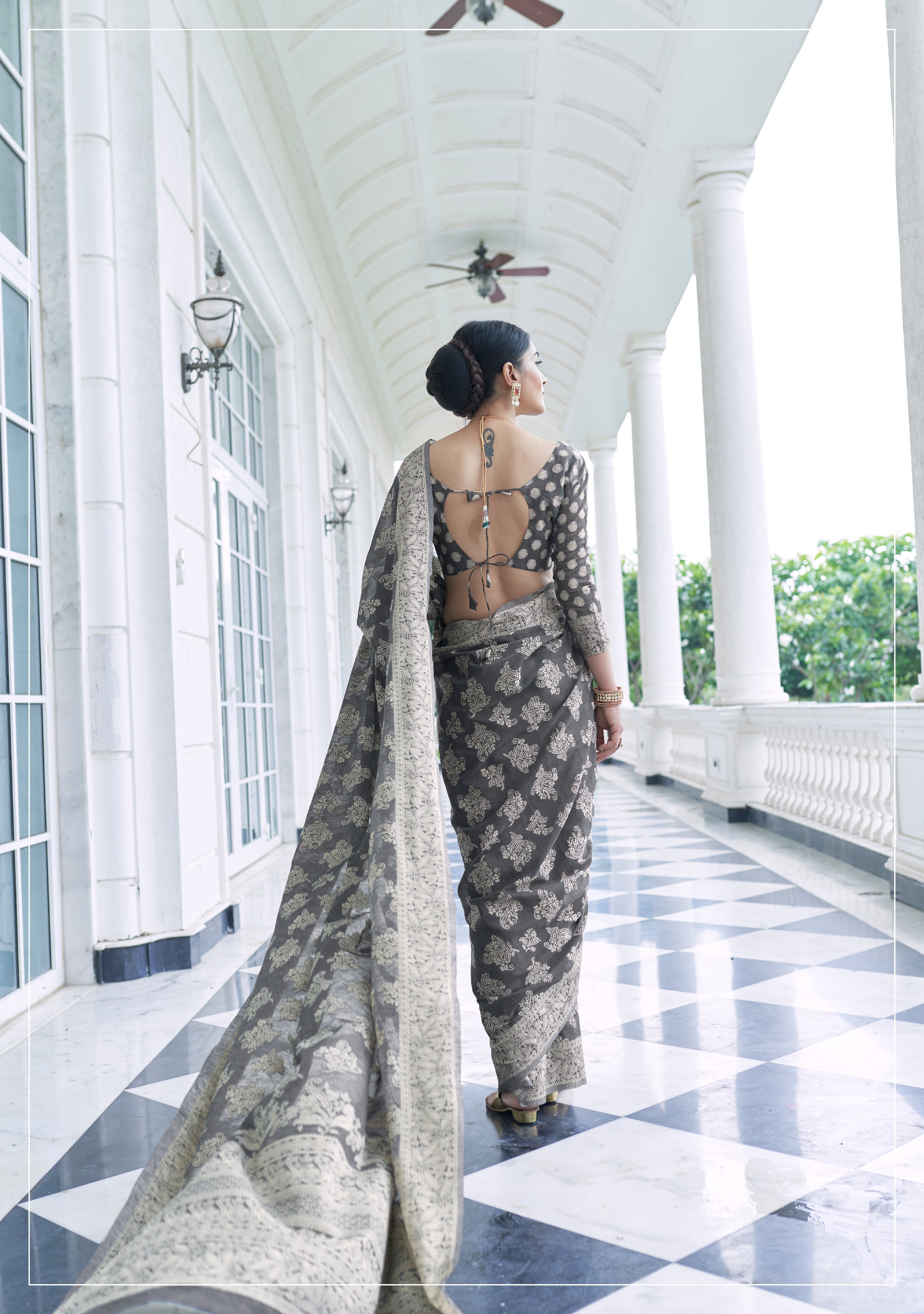 Elevate your style with our Silver Grey Lucknowi Chikankari Saree. With over 400 years