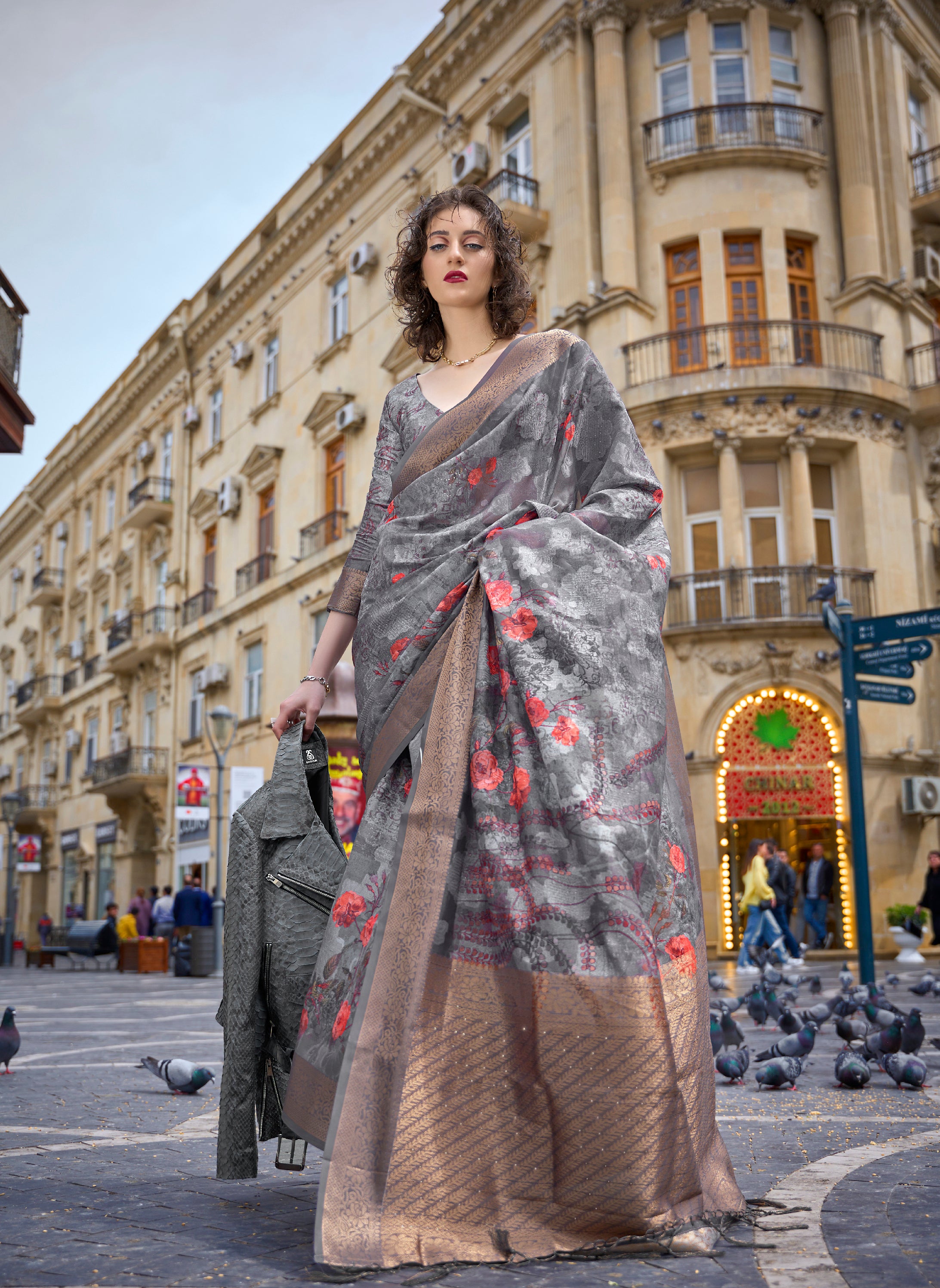 Step into timeless elegance with the Slate Serenity Grey Handloom Poly Brasso Saree, where the versatile grey hue and fine handloom craftsmanship create an enduring style statement.
