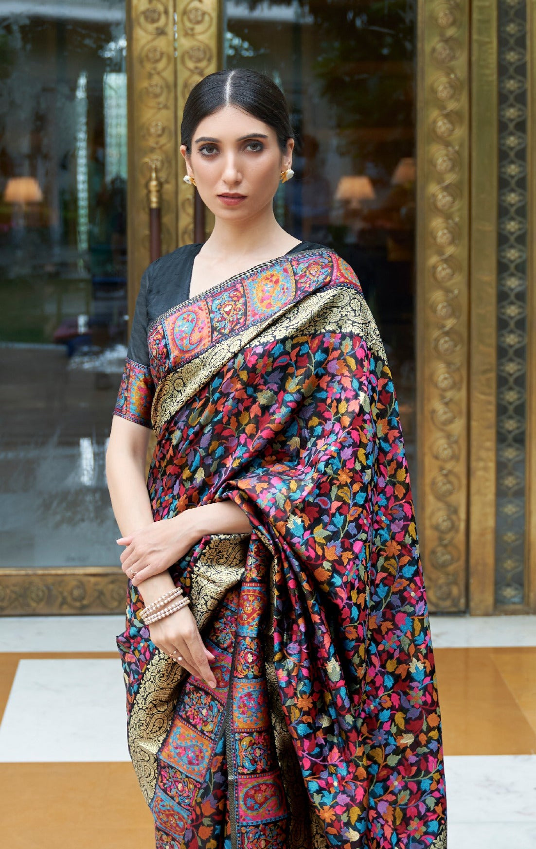 Elevate your ensemble with the Stunning Magenta Kashmiri Modal Silk Saree, designed to capture attention with its intricate craftsmanship and vibrant magenta hue