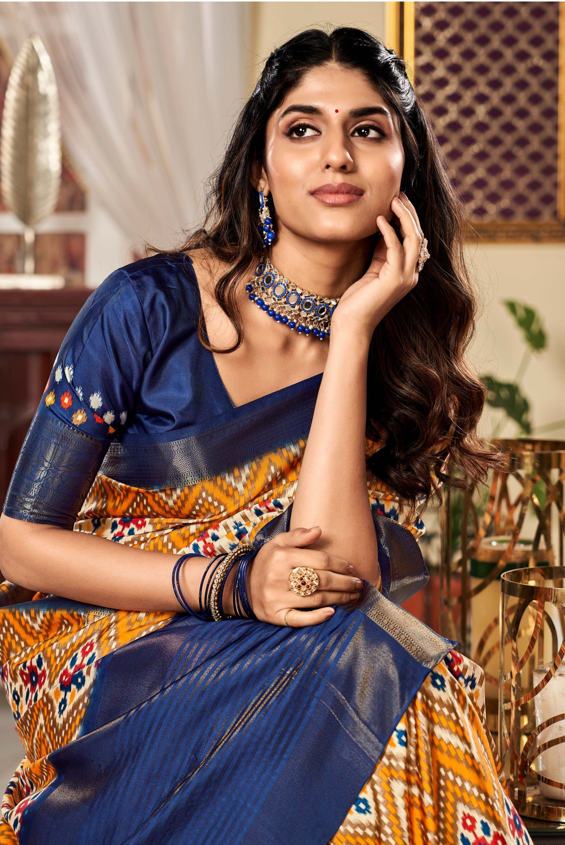 Tacha Yellow and Blue Digital Printed Satin Silk Saree: Radiate Elegance and Vibrancy